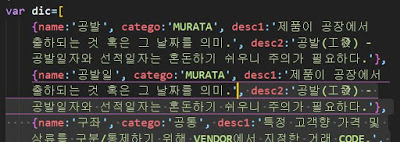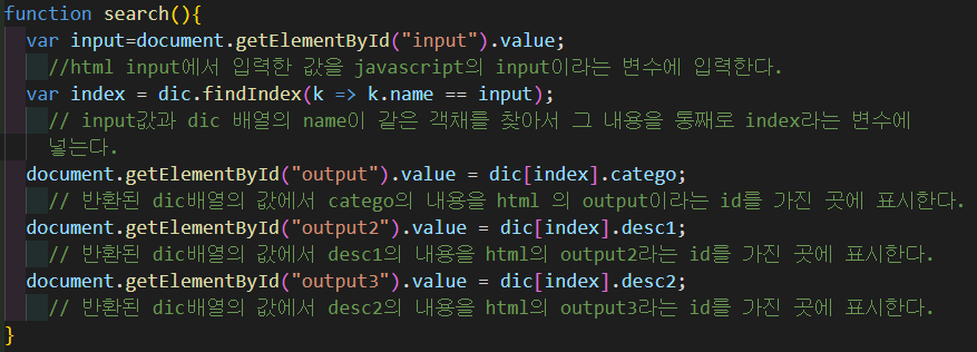 javascrit에 dic이라는 배열함수를 설정하고, 그 배열 안에 검색할 항목(name)과 그 내용(desc)들을 다 입력했다.