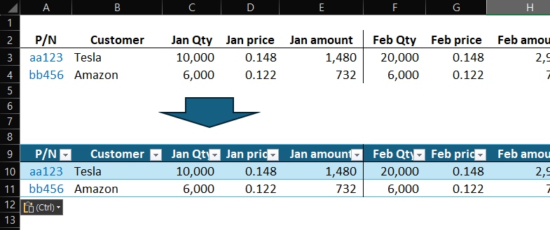 1. 데이터를 선택하고, ctrl+T로 테이블 형식으로 변경 (모든 데이터들은 테이블 형식으로 관리하는게 가시성부터 여러가지로 유리하다.)