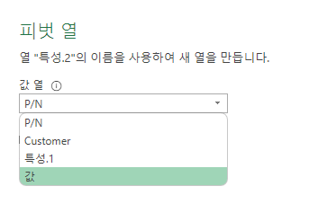 '특성2'열 선택 → '변환' → '피벗 열' 선택 → 피벗 열의 값을 '값'으로 선택하고 '확인'