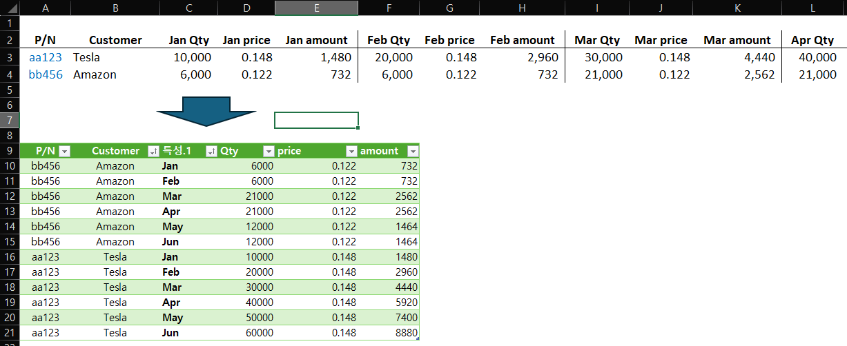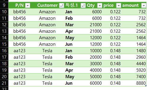 작업 순서는, 파워쿼리에서 데이터를 피벗해제 → '월'과 항목을 분리 → '월' 이외의 항목을 다시 피벗으로 전환