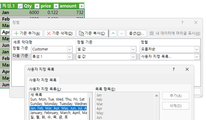 첫 번째 정렬 조건은, P/N이나 customer로 두고, 두 번째 정렬에서 '사용자 지정 목록' 선택하고, 월 목록을 선택해서 정렬해서 완료!!