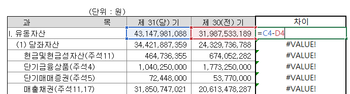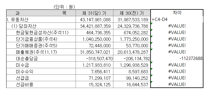 이 텍스트 바꾸기 기능으로 유용하게 활용할 수 있는게, 아래와 같이 인터넷에서 가져 온 자료의 계산이 안되는 경우다.
