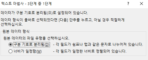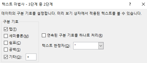 그 구분점은, 탭,세미콜론,쉼표,공백이 기본적으로 있고, 기타에서 내가 다른 기호를 설정할 수 있다.