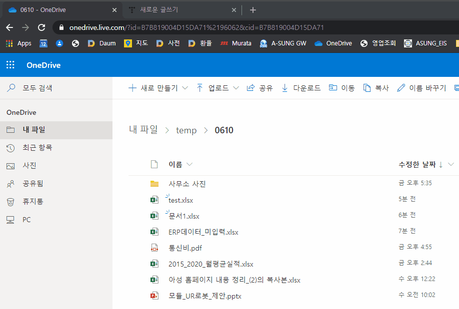 위에서 업무용 파일이 실시간 저장되는 것처럼, 이동시킬 파일을 원드라이브 폴더에 집어넣으면, 다른 어느 기기에서나 다운로드 할 수 있다.