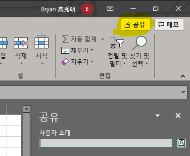 엑셀에서는 우측 상단의 '공유' 버튼을 누른다.