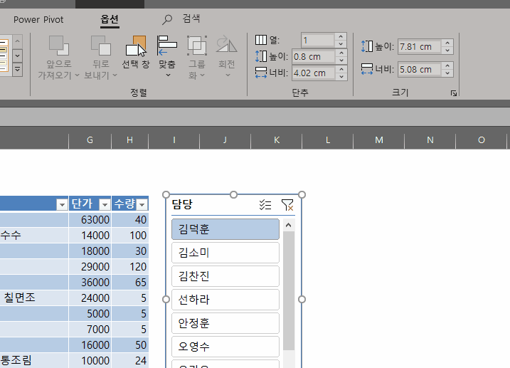 여기서는 단순한 표의 필터를 대신하는 용도로 슬라이서를 사용했지만, 이 슬라이서는 피벗테이블과 함께 사용할 때 효과가 극대화된다.