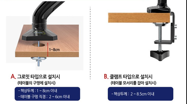 구멍이 있는 책상에 설치하는 것과 내가 한 것처럼 책상에 물려서 세우는 방식이 있다.