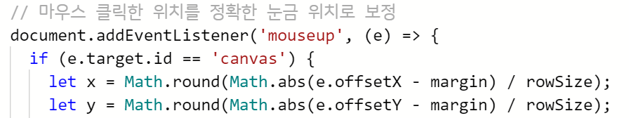 ] 마우스 클릭한 위치를 파악해서 돌을 그리는데, 대충 찍어도 정확한 눈금에 돌이 그려지도록 보정한다.