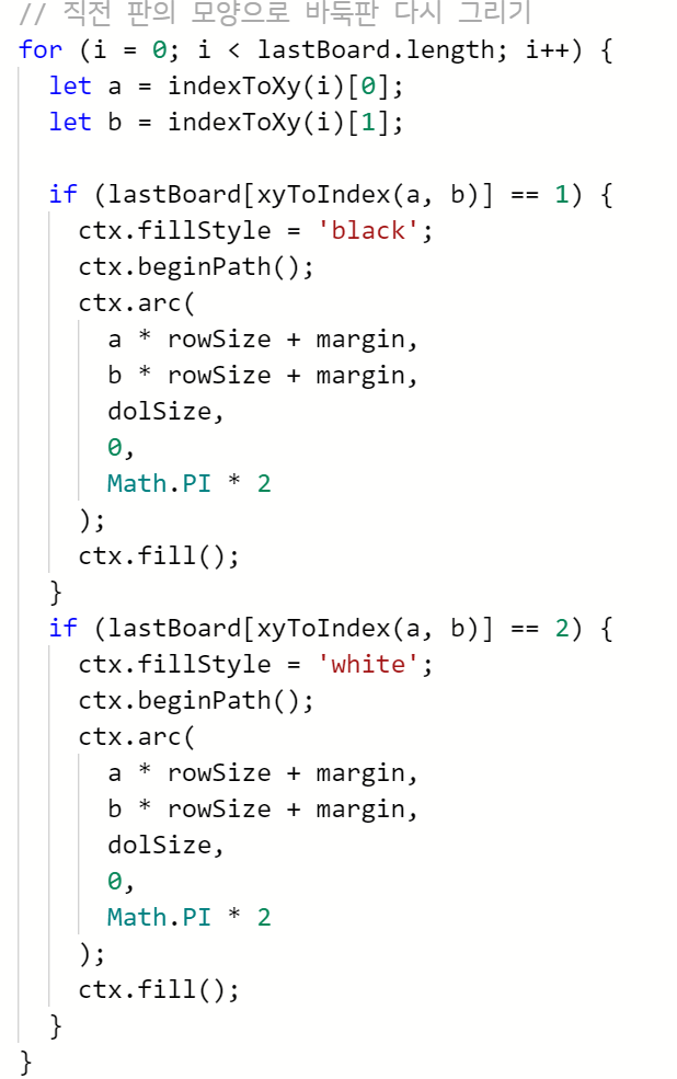 ] 무르기 기능. 돌을 놓을 때마다 그 차례의 바둑판 배열 전체를 또 다른 배열(여기서는 lastBoard[ ])에 넣어나가다가, 무르기가 실행되면 바로 직전의 바둑판 배열을 불러와서 그대로 바둑판을 그려준다.