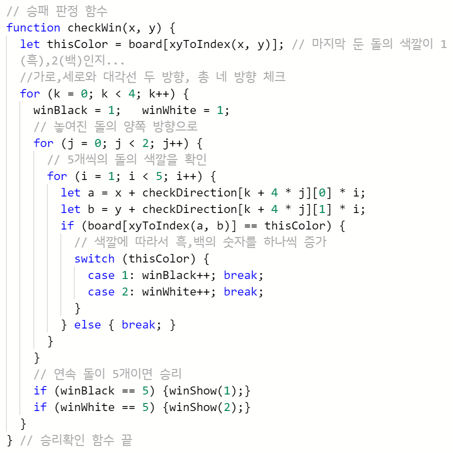 승패확인 함수에서 돌이 오목의 중간에 놓여졌을 때도 5개인지를 확인할 수 있도록 하는 것에서 나름 고민을 했고, 이런 고민의 과정과 그 해결 됬을 때의 기쁨이 코딩하는 즐거움이라고 생각한다.