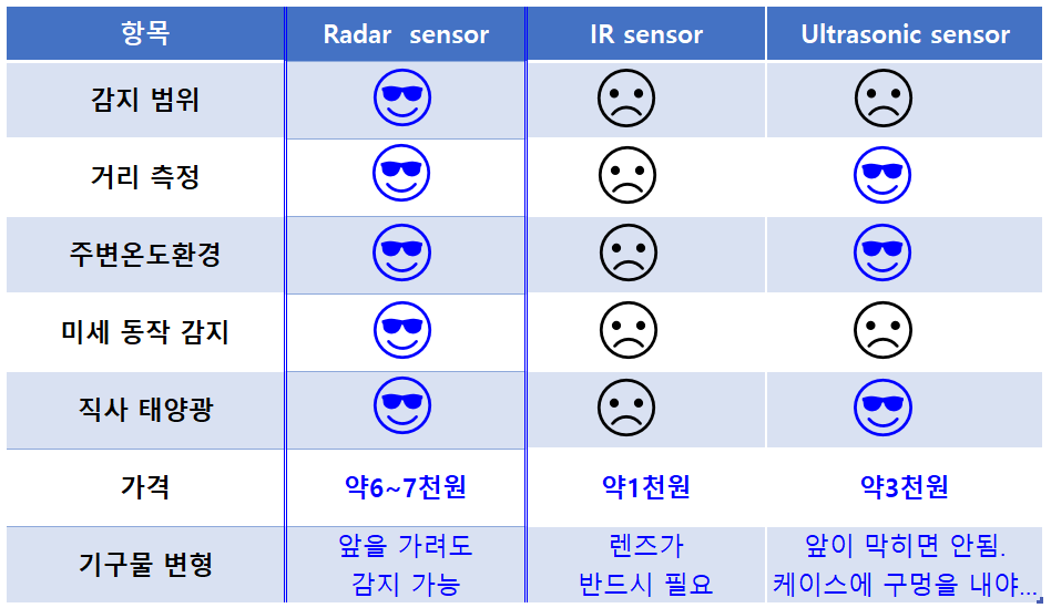 레이다센서는 기존에 많이 사용하는 적외선(IR)센서, 초음파센서에 비해 아래와 같은 장점이 있습니다.