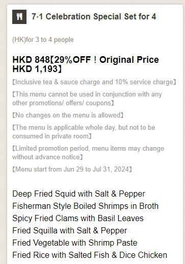 이 식당의 가장 큰 장점은, 식당에서 운영하는 무료 셔틀 보트를 타고 가석 식사를 하고 다시 보트를 타고 돌아오는 점이다. 편도 30분 이상의 보트를 타면서 센트럴의 앞바다 및 홍콩섬 뒤 쪽의 풍경까지 감상할 수 있다.