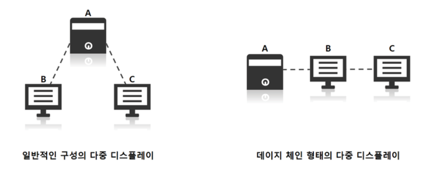 추가적으로, DP포트를 활용하여 '데이지체인(Daisy Chain)'이라고 하나의 모니터 신호에서 여러개의 모니터를 연결할 수도 있다.