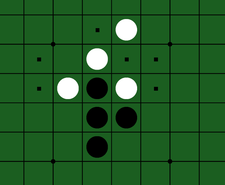 ] 돌을 놓을 수 있는 곳이 제한되어 있다. 오목처럼 아무곳에나 둘 수 있는 것이 아니어서, 둘 수 있는 칸을 매번 계산해서 보여줘야 된다. (검정색,하얀색 조그만 사각형)